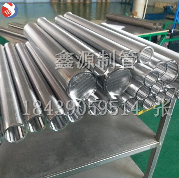 楔形絲濾管,也叫縫隙管、T型絲濾管、全繞焊絲管或約翰遜管由高精密度表絲螺旋形纏繞在軸向支撐筋上,支撐筋和表層絲以電阻焊的方法彼此牢固焊接成一體。這些過濾元件有高精度的特點,縫隙開孔極小并有極佳的圓度。縫隙管可以加裝必須的端蓋、法蘭、絲扣等連接件和加強件。